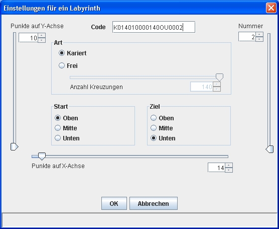 Ihr könnt die Art und die Größe der Labyrinthe frei wählen, bei freien Labyrinthen die Anzahl der Kreuzungspunkte. Ebenso könnt Ihr einstellen, ob Ihr den Hasen oben, in der Mitte oder unten starten lassen wollt, und wo er die Möhre findet. Zu jedem Labyrinth mit derselben Art und Größe könnt Ihr bis zu 10.000 unterschiedliche erzeugen. Dazu benutzt Ihr die "Nummer". Alle diese Einstellungen trefft Ihr im Dialog "Parameter...".